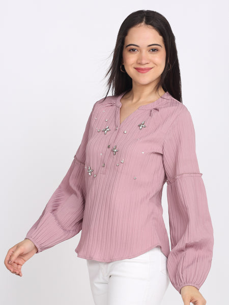 Pink paisley print cuffed sleeves button down party wrap shirt with belt