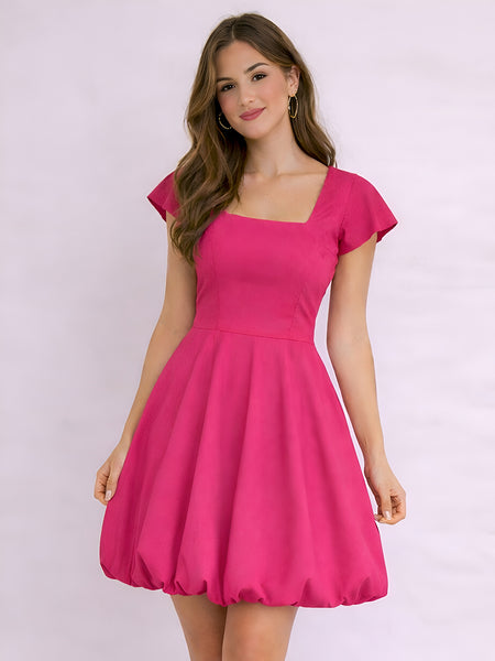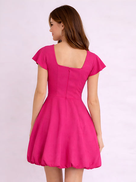 Dark Pink Square Neck Short Sleeves Above Knee Cotton Dress