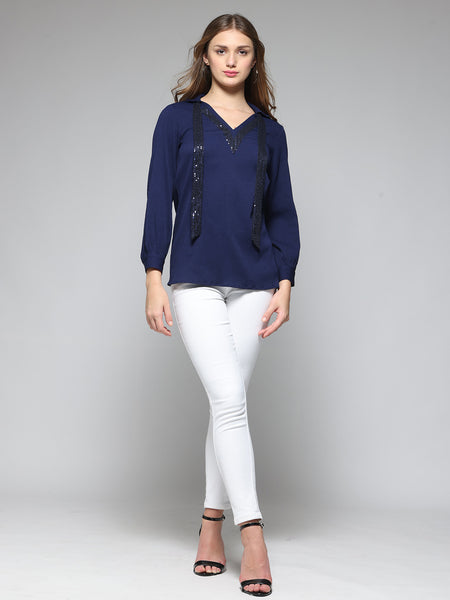Blue shirt collar sequin tie up belt three-quarter sleeves kurti