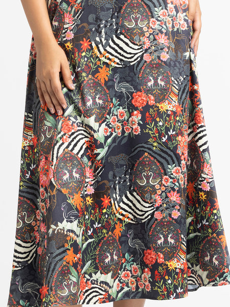 Black heritage print v-neck short raglan sleeves fit and flare midi party dress
