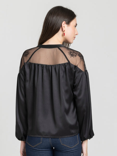 Black v-neck embroidered full elasticated sleeves button down party shirt