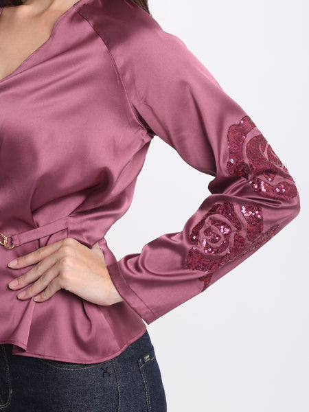 Mauve v-neck embroidered full sleeves wrap party top