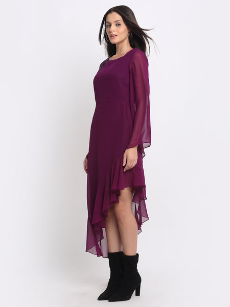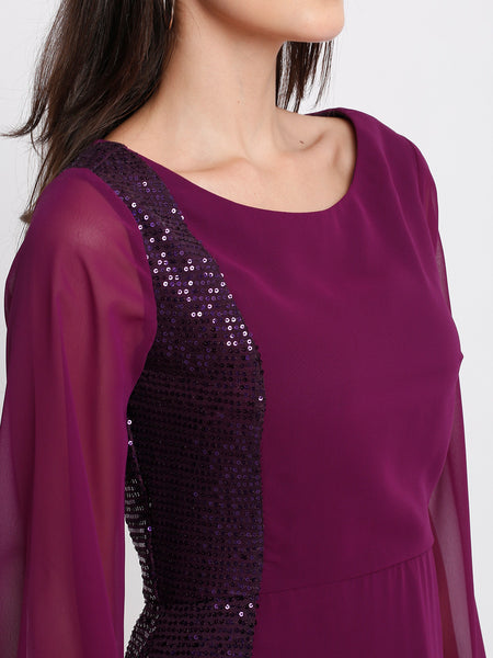 Purple boat neck sequin full bell sleeves fit and flare asymmetric party dress